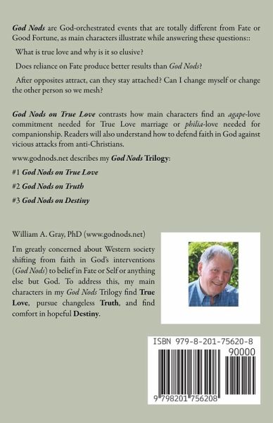 God Nods on True Love (in the God Nods Trilogy) contrasts how main characters find two very different kinds of love: an agape-love commitment needed for True Love marriage or philia-love needed for companionship. Readers will also understand how the Theory of Evolution is trying to refute God's Creation - and HOW to pose Challenging Question that force evolutionists to defend their opinions, which lack scientific evidence. The Theme is: "We know that God causes all things to work together for the good of those who love Him and are called according to His purpose." (Romans 8:28) God Nods are God-orchestrated events - during the good times and the bad times - that fulfill His Purpose for each believer. God Nods are totally different from what "happens" because of Blind Fate, Good Fortune, Lady Luck, Random Chance, or Coincidence. God Nods on True Love addresses important questions that many people ask:After opposites attract, can they stay attached? Can I change myself or change the other person so we mesh? How can what I learned be completely unlearned so that transformational relearning can occur? What is true love and why is it so elusive? Does reliance on Fate produce better results than God Nods [God-orchestrated events, based on Romans 8:28]? How can a Christian defend faith in God and a Bible-based Worldview (Theism) against vicious attacks from anti-Christians?