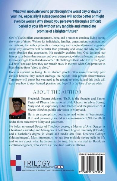 What will motivate you to get through the worst day or days of your life, especially if subsequent ones will not be better or might even be worse? Why should you persevere through a difficult period of your life without any tangible and immediate promise of a brighter future? God of Cycles offers encouragement, hope, and a reason to continue living during the worst of times. Written for individuals, families, organizations, communities, and nations, the author presents a compelling and scripturally-sound argument about why tomorrow will be better than yesterday and today, and why we must never abandon that expectation. He carefully explains how God designed our futures to be better than our past and even our present, while challenging the reader to draw strength from that divine order. He challenges those who live in the "good old days" and asks how they can remain stuck in the past when God promises us lives that go on from "glory to glory." Hope is essential to living. In its absence, people often make extremely poor choices because they cannot envisage life beyond their present circumstances. Tomorrow will come, but you need to be around to enjoy it, and this book will teach you how to stay focused, positive, and hopeful in the face of severe odds.