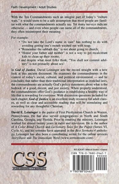 With the Ten Commandments such an integral part of today's "culture wars," it would seem to be a safe assumption that most people are familiar with what the commandments actually say. Yet many surveys indicate otherwise -- and even when people can name all of the commandments, they often misinterpret their meaning. For example: • "Do not take the Lord's name in vain" has nothing to do with avoiding getting one's mouth washed out with soap; • "Remember the sabbath day" is not about going to church; • "Honor your father and mother" is not a way to get recalcitrant kids to clean up their rooms; • and despite what most folks think, "You shall not commit adultery" is not primarily about sex! In God of Justice, David Leininger sets the record straight with a new look at this ancient document. He examines the commandments in the context of today's social, cultural, and political environment -- and he concludes that rather than the traditional view of them as ironclad laws, the commandments are actually God's policy statements about what is the bedrock of a good, decent, and just society. When properly understood, the commandments offer God's guidance in establishing a healthy way of life that is rewarding for everyone. With discussion questions included for each chapter, God of Justice is an excellent study resource for adult classes -- and clear and accessible reading that will be stimulating and rewarding for any thoughtful Christian. David E. Leininger is the pastor of First Presbyterian Church in Warren, Pennsylvania. He has also served congregations in North and South Carolina, Georgia, and Florida. Prior to entering the ministry, Leininger worked for almost twenty years in radio and television. He is the author of A Color-Blind Church and Lectionary Tales for the Pulpit (Series VI, Cycle A), and his sermons have appeared in the Best Sermons 4 anthology (Harper-Collins). Leininger has also been a contributing writer for the online services StoryShare and The Immediate Word (www.sermonsuite.com).