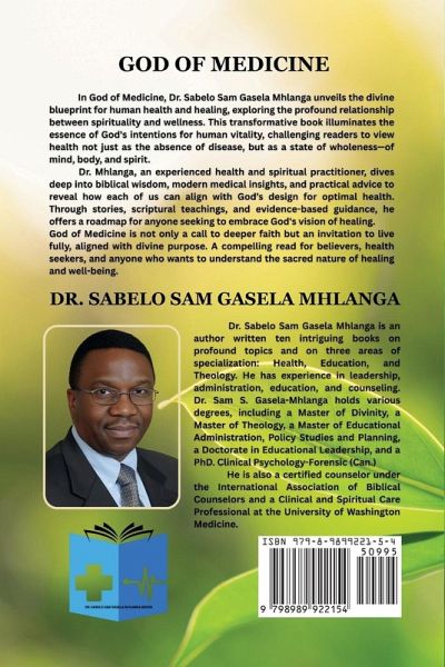 In God of Medicine, Dr. Sabelo Sam Gasela Mhlanga unveils the divine blueprint for human health and healing, exploring the profound relationship between spirituality and wellness. This transformative book illuminates the essence of God's intentions for human vitality, challenging readers to view health not just as the absence of disease, but as a state of wholeness-of mind, body, and spirit. Dr. Mhlanga, an experienced health and spiritual practitioner, dives deep into biblical wisdom, modern medical insights, and practical advice to reveal how each of us can align with God's design for optimal health. Through stories, scriptural teachings, and evidence-based guidance, he offers a roadmap for anyone seeking to embrace God's vision of healing. God of Medicine is not only a call to deeper faith but an invitation to live fully, aligned with divine purpose. A compelling read for believers, health seekers, and anyone who wants to understand the sacred nature of healing and well-being.