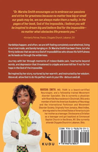 Hardships happen, and often, we are left feeling completely overwhelmed, living in survival mode, and barely hanging on. Dr. Marsha Smith has been there, but she firmly believes that we serve a God of impossibilities who shows His faithfulness as He leads us through the wilderness.Journey with her through moments of indescribable pain, heartache beyond words, and depression that threatened to cripple and even kill her if not for her hope in the God of the impossible. Be inspired by her story, nurtured by her warmth, and instructed by her wisdom. Above all, allow God to do His perfect work in your life-detours and all.