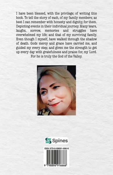 I have been blessed, with the privilege; of writing this book. To tell the story of each, of my family members; as best I can remember with honesty and dignity, for them. Depicting events in their individual journey. Many tears, laughs, sorrow, memories and struggles have overwhelmed my life; and that of my surviving family. Even though I myself, have walked through the shadow of death. Gods mercy and grace have carried me, and guided my every step; and given me the strength to get up every day with gratefulness and praise for, my Lord. For he is truly the God of the Valley.