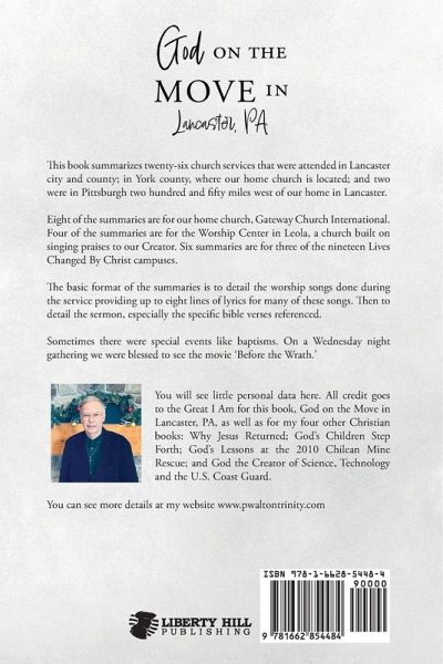 This book summarizes twenty-six church services that were attended in Lancaster city and county; in York county, where our home church is located; and two were in Pittsburgh two hundred and fifty miles west of our home in Lancaster. Eight of the summaries are for our home church, Gateway Church International. Four of the summaries are for the Worship Center in Leola, a church built on singing praises to our Creator. Six summaries are for three of the nineteen Lives Changed By Christ campuses. The basic format of the summaries is to detail the worship songs done during the service providing up to eight lines of lyrics for many of these songs. Then to detail the sermon, especially the specific bible verses referenced. Sometimes there were special events like baptisms. On a Wednesday night gathering we were blessed to see the movie 'Before the Wrath.' You will see little personal data here. All credit goes to the Great I Am for this book, God on the Move in Lancaster, PA, as well as for my four other Christian books: Why Jesus Returned; God's Children Step Forth; God's Lessons at the 2010 Chilean Mine Rescue; and God the Creator of Science, Technology and the U.S. Coast Guard. You can see more details at my website www.pwaltontrinity.com