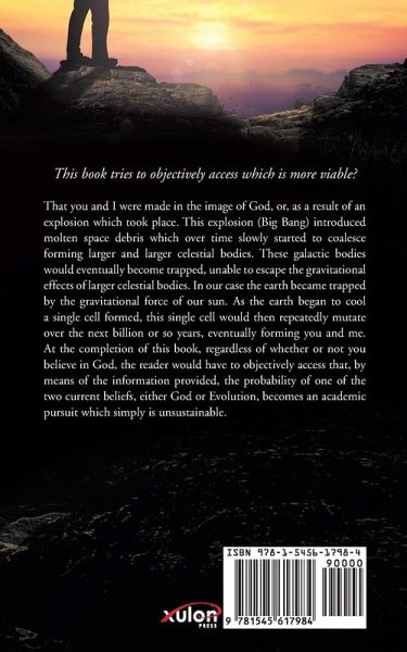 This book tries to objectively access which is more viable? That you and I were made in the image of God, or, as a result of an explosion which took place. This explosion (Big Bang) introduced molten space debris which over time slowly started to coalesce forming larger and larger celestial bodies. These galactic bodies would eventually become trapped, unable to escape the gravitational effects of larger celestial bodies. In our case the earth became trapped by the gravitational force of our sun. As the earth began to cool a single cell formed, this single cell would then repeatedly mutate over the next billion or so years, eventually forming you and me. At the completion of this book, regardless of whether or not you believe in God, the reader would have to objectively access that, by means of the information provided, the probability of one of the two current beliefs, either God or Evolution, becomes an academic pursuit which simply is unsustainable.