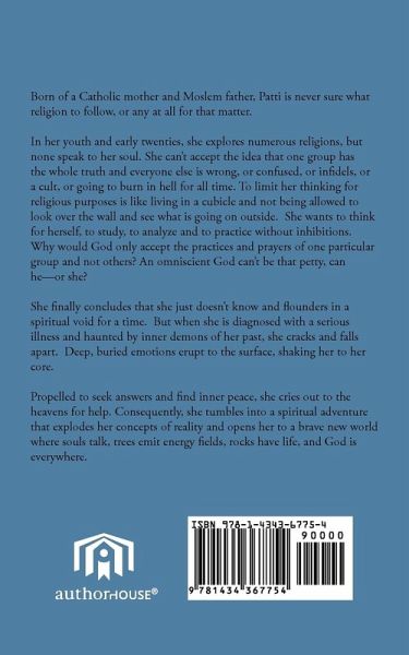 Born of a Catholic mother and Moslem father, Patti is never sure what religion to follow, or any at all for that matter. In her youth and early twenties, she explores numerous religions, but none speak to her soul. She can't accept the idea that one group has the whole truth and everyone else is wrong, or confused, or infidels, or a cult, or going to burn in hell for all time. To limit her thinking for religious purposes is like living in a cubicle and not being allowed to look over the wall and see what is going on outside. She wants to think for herself, to study, to analyze and to practice without inhibitions. Why would God only accept the practices and prayers of one particular group and not others? An omniscient God can't be that petty, can he-or she? She finally concludes that she just doesn't know and flounders in a spiritual void for a time. But when she is diagnosed with a serious illness and haunted by inner demons of her past, she cracks and falls apart. Deep, buried emotions erupt to the surface, shaking her to her core. Propelled to seek answers and find inner peace, she cries out to the heavens for help. Consequently, she tumbles into a spiritual adventure that explodes her concepts of reality and opens her to a brave new world where souls talk, trees emit energy fields, rocks have life, and God is everywhere.