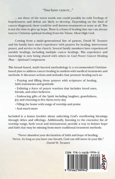 "You have cancer..." ... are three of the worst words one could possibly be told. Feelings of hopelessness and defeat are likely to develop. Depending on the kind of cancer diagnosed, there could be well-known treatments or none at all. This is not the time to give up hope, There is a form of healing that one can always turn to: Christian spiritual healing from the Triune, Most High God. Coming from a multi-generational line of pastors, David W. Treaster and his family have much experience with prayers for healing, intercessory prayer, and service to the church. Several family members have experienced notable healings, including multiple cancer healings. This experience and knowledge is now being shared with others in God Power Cancer Healing Plan - Spiritual Component. This broad-based, multi-faceted methodology is a recommended Christian-based plan to address cancer healing in tandem with medical treatments and methods. It discusses actions and attitudes that promote healing such as: - Praying and filling those prayers with scriptures of healing, faith statements and gratitude - Enlisting a force of prayer warriors that includes loved ones, friends, and other believers - Embracing gifts of the Spirit including laughter, gratefulness, joy and choosing to live them every day - Filling the home with songs of worship and praise - And much more Included is a bonus booklet about unlocking God's overflowing blessings through tithes and offerings. Additionally, listening to the extensive list of worship songs, both vocal and instrumental, provide a way to bolster hope and faith that may be missing from more traditional treatment methods. "Never abandon your declaration of faith and hope of healing. Never. As long as you have one breath, God can still move in your life." -David W. Treaster