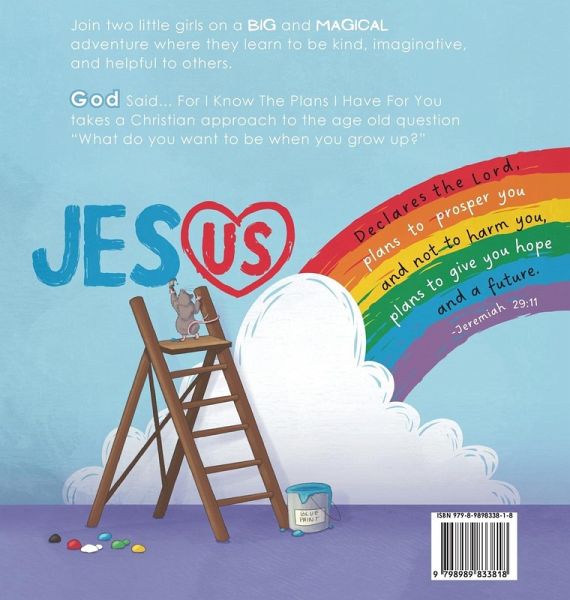 Join two little girls on a BIG and MAGICAL adventure where they learn to be kind, imaginative, and helpful to others. God Said...For I Know The Plans I Have For You takes a Christian approach to the age old question "What do you want to be when you grow up?"