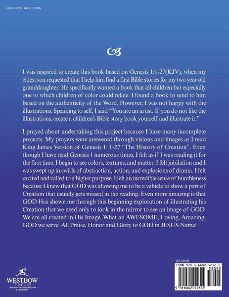 I was inspired to create this book based on Genesis 1:1-27(KJV), when my eldest son requested that I help him find a first Bible stories for my two year old granddaughter. He specifically wanted a book that all children but especially one to which children of color could relate. I found a book to send to him based on the authenticity of the Word. However, I was not happy with the illustrations. Speaking to self, I said "You are an artist. If you do not like the illustrations, create a children's Bible story book yourself and illustrate it." I prayed about undertaking this project because I have many incomplete projects. My prayers were answered through visions and images as I read King James Version of Genesis 1: 1-27 "The History of Creation". Even though I have read Genesis 1 numerous times, I felt as if I was reading it for the first time. I begin to see colors, textures, and matter. I felt jubilation and I was swept up in swirls of abstraction, action, and explosions of drama. I felt excited and called to a higher purpose. I felt an incredible sense of humbleness because I knew that GOD was allowing me to be a vehicle to show a part of Creation that usually gets missed in the reading. Even more amazing is that GOD Has shown me through this beginning exploration of illustrating his Creation that we need only to look in the mirror to see an image of GOD. We are all created in His Image. What an AWESOME, Loving, Amazing, GOD we serve. All Praise, Honor and Glory to GOD in JESUS Name!