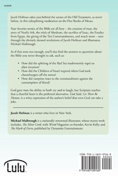 Jacob Hofman takes you behind the scenes of the Old Testament, as never before, in this sidesplitting meditation on the Five Books of Moses. Your favorite bible stories are all here - the creation of man, the story of Noah's Ark, the trials of Abraham, the Exodus from Egypt, the giving of the Ten Commandments, and much more - seen through the divinely skewed revelations of Jacob Hofman and illustrator, Michael Malbrough. As if that were not enough, you'll also find the answers to questions about the Bible you never thought to ask, such as: ¿ How did the splitting of the Red Sea inadvertently repel an alien invasion? ¿ How did the Children of Israel respond when God took cheeseburgers off the menu? ¿ How did vampires react to the commandment against the consumption of blood? God gave man the ability to both cry and to laugh, but Scripture teaches that a cheerful heart is the preferred alternative. God Said, Let There Be Humor, is a witty expression of the author's belief that even God can take a joke.