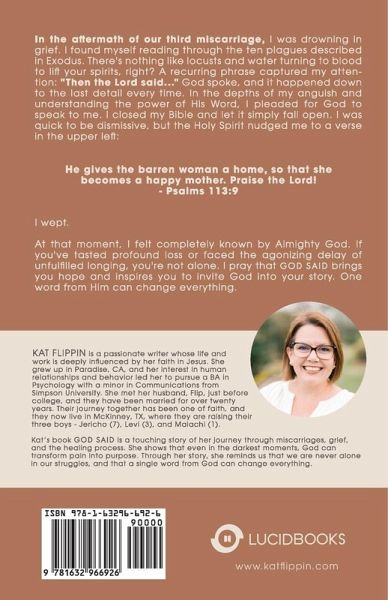 Kat Flippin is a passionate writer whose life and work are deeply influenced by her faith in Jesus. She grew up in Paradise, CA, and her interest in human relationships and behavior led her to pursue a BA in Psychology with a minor in Communications from Simpson University. She met her husband, Flip, just before college, and they have been married for over twenty years. Their journey together has been one of faith, and they now live in McKinney, TX, where they are raising their three boys - Jericho (7), Levi (3), and Malachi (1). Kat's book, God Said, is a touching story of her journey through miscarriages, grief, and the healing process. She shows that even in the darkest moments, God can transform pain into purpose. Through her story, she reminds us that we are never alone in our struggles and that a single word from God can change everything.