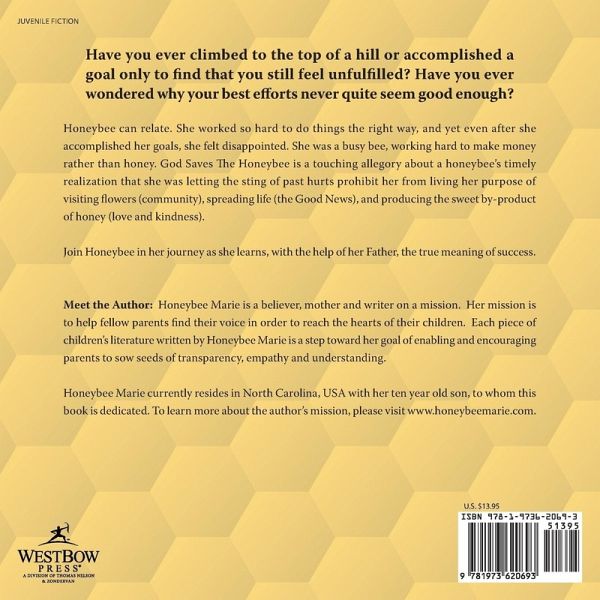 Have you ever climbed to the top of a hill or accomplished a goal only to find that you still feel unfulfilled? Have you ever wondered why your best efforts never quite seem good enough? Honeybee can relate. She worked so hard to do things the right way, and yet even after she accomplished her goals, she felt disappointed. She was a busy bee, working hard to make money rather than honey. God Saves The Honeybee is a touching allegory about a honeybees timely realization that she was letting the sting of past hurts prohibit her from living her purpose of visiting flowers (community), spreading life (the Good News), and producing the sweet by-product of honey (love and kindness). Join Honeybee in her journey as she learns, with the help of her Father, the true meaning of success.