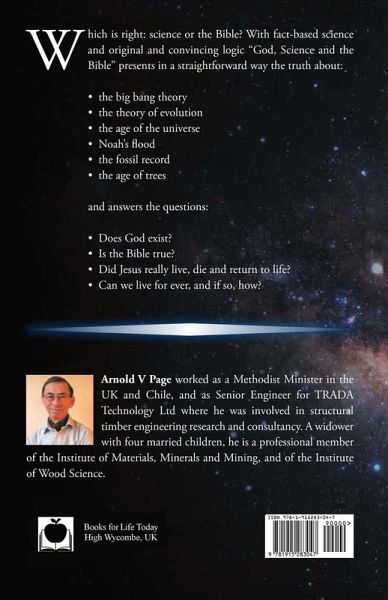 This book explains clearly and comprehensively why conventional science and the Bible conflict over the origin of the universe and life on planet Earth. Applying universally accepted laws of science to the creation of the universe, and Darwin's four requirements for new species to develop, Arnold V Page shows that the Bible's teaching on these subjects is true, and how scentific facts support it. The book also covers the historical evidence for Jesus Christ's resurrection, and it includes fascinating accounts of events in the author's life which have convinced him that the God of the Bible is real. With full Bible references and footnoted references to all the cited literature, God, Science and the Bible provides a valuable resource for Christian ministers, teachers, and the ordinary lay person who wants to know whether to believe in the Big Bang theory, the Theory of Evolution, or the Holy Bible, and why it is so important to get it right. Arnold V Page has been an ordained Christian minister for twenty-five years, and a structural research engineer for a further twenty-one years, retiring as senior engineer for TRADA Technology Ltd. He is a professional member of the Institute of Wood Science, and of the Institute of Materials, Minerals and Mining.