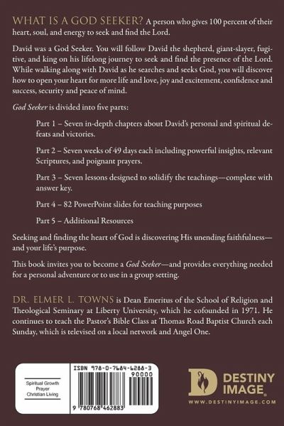 What is a God Seeker? A person who gives 100 percent of their heart, soul, and energy to seek and find the Lord. David was a God Seeker. You will follow David the shepherd, giant-slayer, fugitive, and king on his lifelong journey to seek and find the presence of the Lord. While walking along with David as he searches and seeks God, you will discover how to open your heart for more life and love, joy and excitement, confidence and success, security and peace of mind. God Seeker is divided into five parts: Part 1 - Seven in-depth chapters about David's personal and spiritual defeats and victories. Part 2 - Seven weeks of 49 days each including powerful insights, relevant Scriptures, and poignant prayers. Part 3 - Seven lessons designed to solidify the teachings-complete with answer key. Part 4 - 82 PowerPoint slides for teaching purposesPart 5 - Additional Resources Seeking and finding the heart of God is discovering His unending faithfulness-and your life's purpose. This book invites you to become a God Seeker-and provides everything needed for a personal adventure or to use in a group setting.