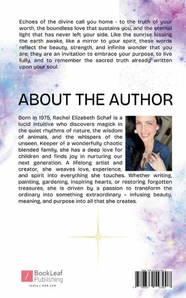 Born in 1975, Rachel Elizabeth Schaf is a lucid intuitive who discovers magick in the quiet rhythms of nature, the wisdom of animals, and the whispers of the unseen. Keeper of a wonderfully chaotic blended family, she has a deep love for children and finds joy in nurturing our next generation. A lifelong artist and creator, she weaves love, experience, and spirit into everything she touches. Whether writing, painting, gardening, inspiring hearts, or restoring forgotten treasures, she is driven by a passion to transform the ordinary into something extraordinary - infusing beauty, meaning, and purpose into all that she creates.