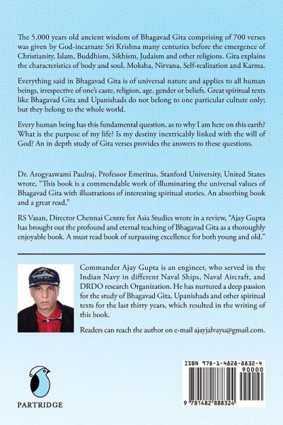 The 5,000 years old ancient wisdom of Bhagavad Gita comprising of 700 verses was given by God-incarnate Sri Krishna many centuries before the emergence of Christianity, Islam, Buddhism, Sikhism, Judaism and other religions. Gita explains the characteristics of body and soul, Moksha, Nirvana, Self-realization and Karma. Everything said in Bhagavad Gita is of universal nature and applies to all human beings, irrespective of one’s caste, religion, age, gender or beliefs. Great spiritual texts like Bhagavad Gita and Upanishads do not belong to one particular culture only; but they belong to the whole world. Every human being has this fundamental question, as to why I am here on this earth? What is the purpose of my life? Is my destiny inextricably linked with the will of God? An in depth study of Gita verses provides the answers to these questions. Dr. Arogyaswami Paulraj, Professor Emeritus, Stanford University, United States wrote, "This book is a commendable work of illuminating the universal values of Bhagavad Gita with illustrations of interesting spiritual stories. An absorbing book and a great read," RS Vasan, Director Chennai Centre for Asia Studies wrote in a review, "Ajay Gupta has brought out the profound and eternal teaching of Bhagavad Gita as a thoroughly enjoyable book. A must read book of surpassing excellence for both young and old."