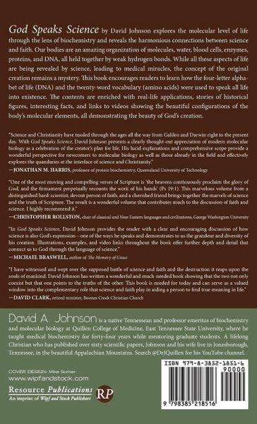 God Speaks Science by David Johnson explores the molecular level of life through the lens of biochemistry and reveals the harmonious connections between science and faith. Our bodies are an amazing organization of molecules, water, blood cells, enzymes, proteins, and DNA, all held together by weak hydrogen bonds. While all these aspects of life are being revealed by science, leading to medical miracles, the concept of the original creation remains a mystery. This book encourages readers to learn how the four-letter alphabet of life (DNA) and the twenty-word vocabulary (amino acids) were used to speak all life into existence. The contents are enriched with real-life applications, stories of historical figures, interesting facts, and links to videos showing the beautiful configurations of the body's molecular elements, all demonstrating the beauty of God's creation.