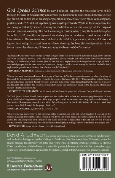 God Speaks Science by David Johnson explores the molecular level of life through the lens of biochemistry and reveals the harmonious connections between science and faith. Our bodies are an amazing organization of molecules, water, blood cells, enzymes, proteins, and DNA, all held together by weak hydrogen bonds. While all these aspects of life are being revealed by science, leading to medical miracles, the concept of the original creation remains a mystery. This book encourages readers to learn how the four-letter alphabet of life (DNA) and the twenty-word vocabulary (amino acids) were used to speak all life into existence. The contents are enriched with real-life applications, stories of historical figures, interesting facts, and links to videos showing the beautiful configurations of the body's molecular elements, all demonstrating the beauty of God's creation.