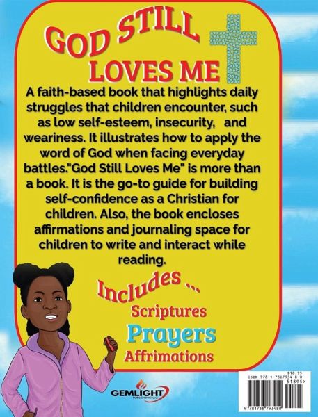 A faith-based book that highlights daily struggles that children encounter, such as low self-esteem, insecurity, and weariness. It illustrates how to apply the word of God when facing everyday battles."God Still Loves Me" is more than a book. It is the go-to guide for building self-confidence as a Christian for children. Also, the book encloses affirmations and journaling space for children to write and interact while reading. A must-read for children, preteens, and teens to help cultivate their relationships with Christ while managing daily thoughts, patterns, feelings, and social interactions.