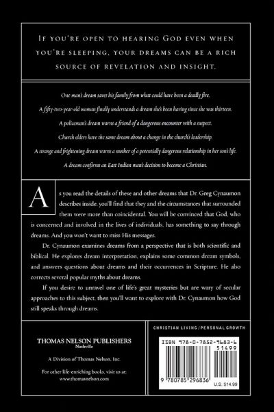If you're open to hearing God even when you're sleeping, your dreams can be a rich source of revelation and insight. One man's dream saves his family from what could have been a deadly fire. A fifty-two-year-old woman finally understands a dream she's been having since she was thirteen. A policeman's dream warns a friend of a dangerous encounter with a suspect. Church elders have the same dream about a change in the church's leadership. A strange and frightening dream warns a mother of a potentially dangerous relationship in her son's life. A dream confirms an East Indian man's decision to become a Christian. As you read the details of these and other dreams that Dr. Greg Cynaumon describes you will find that they and the circumstances that surrounded them were more than conincidental. You will be convinced that God, who is concerned and involved in the lives of individuals, has somehting to say through dreams. And you won't want to miss His messages. Dr. Cynaumon examines dreams from a perspective that is both scientific and biblical. He explores dream interpretation, explains some common dream symbols, and answers questions about dreams and their occurrences in Scripture. He also corrects several popular myths about dreams. If you desire to unravel one of life's great mysteries but are wary of secular approaches to this subject, then you'll want to explore with Dr. Cynaumon how God still speaks through dreams.