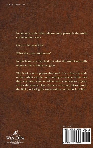 In one way or the other, almost every person in the world communicates about God, or the word God. What does that word mean? In this book you may find out what the word God really means, in the Christian religion. This book is not a pleasurable novel. It is a fact base study of the earliest and the most intelligent writers of the first three centuries, some of whom were companions of Jesus and or the apostles, like Clement of Rome, referred to in the Bible, as having his name written in the book of life.