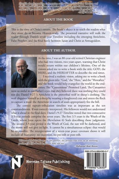 This is the time of Christ's return. The book's object is to teach the readers what they must do to become Heaven-ready. The presented narrative will walk the reader through Daniels seven-year Timeline including the emerging Antichrist, False Prophet, and the final battle between Satan and Him at Armageddon At the time, I was an 80-year-old retired Christian engineer who had two visions, two years apart, warning that Christ would return within our children's lifetime. One of the visions asked me to write a book with the title: GOD, the HERE, and the HEREAFTER to describe the end times. I received a realistic vision, asking me to write a book with the given title: "God," the "Here," and the "Hereafter," and the book would help evangelize the world in the end-times; The "Contentious" Promised Land, The Canaanites were so sinful in our Father's eyes that they believed there was nothing they could not do; Daniel 9:27 's Antichrist is the proverbial wolf in sheep's clothing. The wolf disguises himself as a sheep by wearing a slaughtered coat and enters the flock to capture a meal: the Antichrist in search of souls appropriately fits the bill. The correct rapture-tribulation timeline was as important as the ten commandments. If not correctly interpreted, His followers would not understand what is ahead in the final days. Daniel's 9:27 Timeline noted that two consecutive 3.5-year periods comprise the seven years. The first 3.5 years is the Wrath of the Lamb, where Jesus opens the (Revelation 6) Seals describing those judgments. The second 3.5-year period is the Wrath of God, the sun will be darkened, and the moon will not give its light. It cannot be a simultaneous eclipse: that would be impossible; The interpretation of a seven-year peace covenant shows it will include all humanity: no exception, no pre-trib or post-trib.