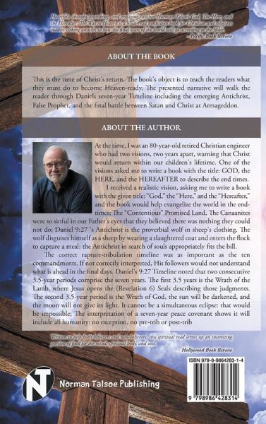 This is the time of Christ's return. The book's object is to teach the readers what they must do to become Heaven-ready. The presented narrative will walk the reader through Daniels seven-year Timeline including the emerging Antichrist, False Prophet, and the final battle between Satan and Him at Armageddon At the time, I was an 80-year-old retired Christian engineer who had two visions, two years apart, warning that Christ would return within our children's lifetime. One of the visions asked me to write a book with the title: GOD, the HERE, and the HEREAFTER to describe the end times. I received a realistic vision, asking me to write a book with the given title: "God," the "Here," and the "Hereafter," and the book would help evangelize the world in the end-times; The "Contentious" Promised Land, The Canaanites were so sinful in our Father's eyes that they believed there was nothing they could not do; Daniel 9:27 's Antichrist is the proverbial wolf in sheep's clothing. The wolf disguises himself as a sheep by wearing a slaughtered coat and enters the flock to capture a meal: the Antichrist in search of souls appropriately fits the bill. The correct rapture-tribulation timeline was as important as the ten commandments. If not correctly interpreted, His followers would not understand what is ahead in the final days. Daniel's 9:27 Timeline noted that two consecutive 3.5-year periods comprise the seven years. The first 3.5 years is the Wrath of the Lamb, where Jesus opens the (Revelation 6) Seals describing those judgments. The second 3.5-year period is the Wrath of God, the sun will be darkened, and the moon will not give its light. It cannot be a simultaneous eclipse: that would be impossible; The interpretation of a seven-year peace covenant shows it will include all humanity: no exception, no pre-trib or post-trib.