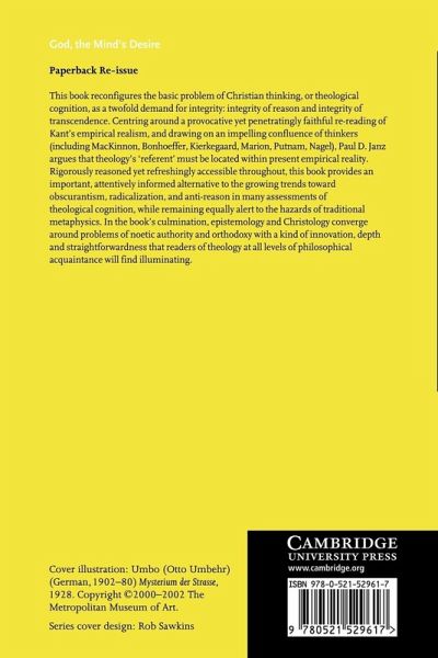This 2004 book reconfigures the basic problem of Christian thinking - 'How can human discourse refer meaningfully to a transcendent God?' - as a twofold demand for integrity: integrity of reason and integrity of transcendence. Centring around a provocative yet penetratingly faithful re-reading of Kant's empirical realism, and drawing on an impelling confluence of contemporary thinkers (including MacKinnon, Bonhoeffer, Marion, Putnam, Nagel) Paul D. Janz argues that theology's 'referent' must be located within present empirical reality. Rigorously reasoned yet refreshingly accessible throughout, this book provides an important, attentively informed alternative to the growing trends toward obscurantism, radicalization and anti-reason in many recent assessments of theological cognition, while remaining equally alert to the hazards of traditional metaphysics. In the book's culmination, epistemology and Christology converge around problems of noetic authority and orthodoxy with a kind of innovation, depth and straightforwardness that readers of theology at all levels of philosophical acquaintance will find illuminating.