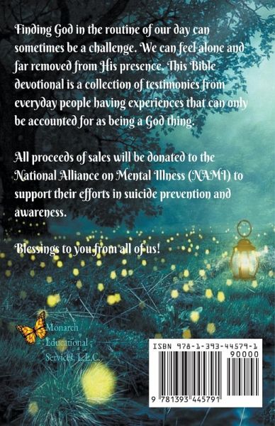 Finding God in the routine of our day can sometimes be a challenge. We can feel alone and far removed from His presence. This Bible devotional is a collection of testimonies from everyday people having experiences that can only be accounted for as being a God thing. All proceeds of sales will be donated to the National Alliance on Mental Illness (NAMI) to support their efforts in suicide prevention and awareness. Blessings to you from all of us!
