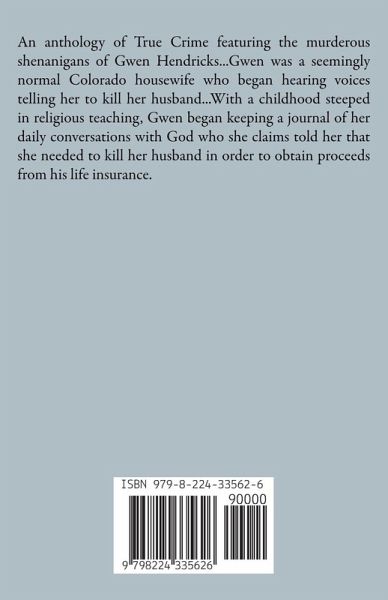 An anthology of True Crime featuring the murderous shenanigans of Gwen Hendricks...Gwen was a seemingly normal Colorado housewife who began hearing voices telling her to kill her husband...With a childhood steeped in religious teaching, Gwen began keeping a journal of her daily conversations with God who she claims told her that she needed to kill her husband in order to obtain proceeds from his life insurance.