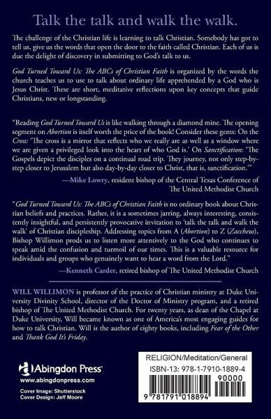Talk the talk and walk the walk. The challenge of the Christian life is learning to talk Christian. Somebody has got to tell us, give us the words that open the door to the faith called Christian. Each of us is due the delight of discovery that in submitting to God's talk to us. God Turned Toward Us: The ABCs of Christian Faith is organized by the words the church teaches us to use to talk about ordinary life apprehended by a God who is Jesus Christ-short, meditative reflections upon key concepts that guide Christians, new or longstanding. Praise for God Turned Towards Us "Reading God Turned Towards Us is like walking through a diamond mine. The opening segment on "Abortion" is itself worth the price of the book! Consider these gems: On the Cross: "The cross is a mirror that reflects who we really are as well as a window where we are given a privileged look into the heart of who God is." On Sanctification: "The Gospels depict the disciples on a continual road trip. They journey, not only step-by-step closer to Jerusalem but also day-by day closer to Christ, that is, sanctification." --Mike Lowry, Resident Bishop of the Central Texas Conference of The United Methodist Church God Turned Toward Us: The ABCs of Christian Faith is no ordinary book about Christian beliefs and practices. Rather, it is a sometimes jarring, always interesting, consistently insightful, and persistently provocative invitation to "talk the talk and walk the walk" of Christian discipleship. Addressing topics from A (Abortion) to Z (Zaccheus), Bishop Willimon prods us to listen more attentively to the God who continues to speak amid the confusion and turmoil of our times. This is a valuable resource for individuals and groups who genuinely want to hear a word from the Lord. --Kenneth Carder, Retired Bishop of The United Methodist Church