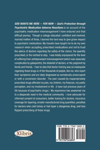 GOD WANTS ME HERE -- FOR NOW -- God's Protection through Psychiatric Medication Adverse Reactions is an account of the psychiatric medication mismanagement I have endured and that difficult journey. Though a college educated, confident and involved, married mother of three, I learned the hard way to give grave respect to psychiatric medications. My travails have taught me to do my own research when accepting prescribed medications and not to trust the advice of doctors regarding the safety of the choice, the quantity prescribed, or the method to stop. I was totally unprepared for the level of suffering from antidepressant mismanagement (which was especially complicated by Gabapentin), the disbelief of doctors, or the judgment by family and friends. I had no idea that doctor training was so inadequate regarding those drugs or of the thousands of people, like me, who report their symptoms and are daily diagnosed as somatically preoccupied or with a conversion disorder. The pain caused by inappropriately prescribed drugs affected my jobs, my children, my finances, my public perception, and my involvement in life. (I have lost precious years of life because of psychiatric drugs.) My experience has awakened me to a desperate need in the medical community. I now advocate for informed consent of consumers, better training for doctors, insurance coverage for tapering, smaller manufactured drug quantities, penalties for doctors who cold turkey or fast taper a dangerous drug, and less flippant prescribing of those drugs.