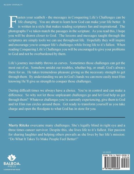 Fasten your seatbelt - the messages in Conquering Life's Challenges can be life changing. You are about to learn how God can make your life better. It is written in a style that makes reading scriptures fun and inspirational. The photographs I've taken match the passages in the scripture. As you read this, I hope you will be drawn closer to God. The lessons and messages taught through the scriptures are simply tools we can use throughout life. Hopefully they will inspire and encourage you to conquer life's challenges while living life to it's fullest. When reading Conquering Life's Challenges you will be encouraged to give your problems to God and not be overburdened by them. Life's journey inevitably throws us curves. Sometimes those challenges can get the most out of us. Somehow amidst our troubles, whether big, or small, God's always there for us. He takes tremendous pleasure giving us the necessary strength to get through them. By understanding we are in God's hands we can more easily trust Him knowing He'll give us strength to conquer those challenges. During difficult times we always have a choice. You're in control and can make a difference. So why not let those unpleasant challenges go and let God help us get through them? Whatever challenges you're currently experiencing, give them to God and let Him run circles around them. Get ready to transform yourself as you take charge and open the floodgate to what God has in store for you.
