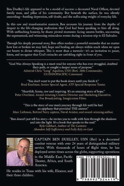 CAPTAIN BEN DUELLEY, USN (Ret) is a decorated combat veteran with over 24 years of distinguished military service. He has deployed seven times across the globe, supporting operations in the Middle East, Pacific Theater, Africa, and South America. Ben was the Commanding Officer of the VAW-113 Black Eagles, served as the Flag Aide to the Deputy Assistant Secretary of the Navy for International Programs, and spent time in the Pentagon managing large-scale budgets and aviation requirements. Throughout his career he had the privilege of serving alongside thousands of sailors, an experience that shaped him in ways he never expected.Ben holds a Bachelor of Science in Mathematics from the United States Naval Academy and a Master's in National Strategic Studies from the Naval War College. He is currently studying at City Point College and the Destiny Leadership Institute, pursuing ordination as a pastor.His debut book, God Was Always Speaking, I Just Wasn't Listening, shares his story of facing internal battles, discovering God's presence, and finding new direction in serving others.He resides in Texas with his wife, Eleanor, and their three children.