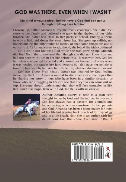 Life is not always perfect, but we have a God that can get us through anything if we let Him. Growing up, author Amanda Murry met many challenges. She didn't feel close to her family and believed she grew in the shadow of her older brother. She didn't feel close to her peers at school, finding a friend in only a little girl down the street from her. She grew up selfish, not understanding the importance of money or that some things are out of our control. As Amanda grew to adulthood, she found the trials continued. But despite not knowing God while she was growing up, Amanda did find God. She discovered that though she did not know him and had not been with Him in her life before this, He was with her. God led her when she needed to be led and showed her the error of ways when it was needed. He taught her hard lessons but also gave her people to love. He has been by her side her whole life, whether she knew it or not. God Was There, Even When I Wasn't was inspired by God. Feeling moved by the Lord, Amanda wanted to share her story. She hopes that by sharing her story, others who have been in a similar situation or those who are struggling in life can see that they too can come out on top. Everyone should understand that they will face struggles in life. But, don't lose hope. Believe in God, for He is with us always. Author Amanda Murry is wife to a man sent straight to her by God and the mother to two sons. She has always had a passion for animals and barrel racing, which was nurtured by her parents and God. Amanda has been a homemaker for most of her life but is going back to school for phycology and is a life coach. Now she is an author with her debut book God Was There, Even When I Wasn't.