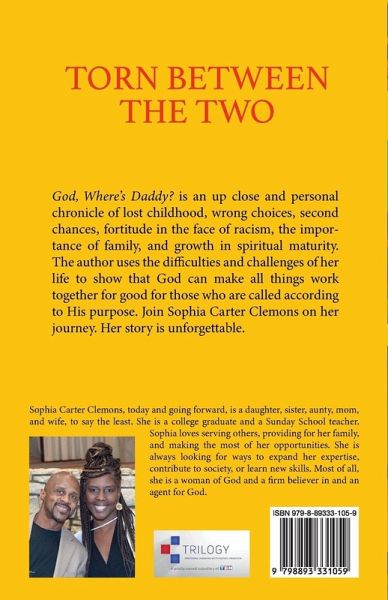 TORN BETWEEN THE TWO God, Where's Daddy? is an up close and personal chronicle of lost childhood, wrong choices, second chances, fortitude in the face of racism, the importance of family, and growth in spiritual maturity. The author uses the difficulties and challenges of her life to show that God can make all things work together for good for those who are called according to His purpose. Join Sophia Carter Clemons on her journey. Her story is unforgettable.