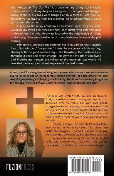 God Whispered "I've Got This" is a documentary of my real-life faith journey, where I tell my story as a caregiver. I share personal struggles when, at times, our lives were hanging on by a thread. Each time we thought we had risen to meet the challenge, we faced a new health battle just around the corner.I speak to the many emotions I experienced as a caregiver while watching my loved one heroically fight each battle with determination and relentless gratitude. He always focused on the positive side of things, and although they were hard to find in many instances, he never stopped looking.…mehr