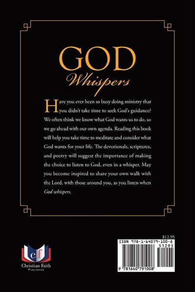 Have you ever been so busy doing ministry that you didn’t take time to seek God’s guidance? We often think we know what God wants us to do, so we go ahead with our own agenda. Reading this book will help you take time to meditate and consider what God wants for your life. The devotionals, scriptures, and poetry will suggest the importance of making the choice to listen to God, even in a whisper. May you become inspired to share your own walk with the Lord, with those around you, as you listen when God whispers.
