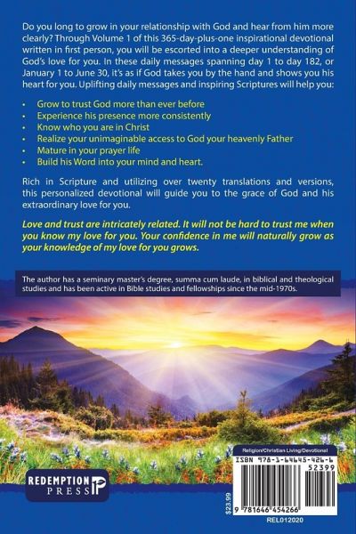Do you long to grow in your relationship with God and hear from him more clearly? Through Volume 1 of this 365-day-plus-one inspirational devotional written in first person, you will be escorted into a deeper understanding of God's love for you. In these daily messages spanning day 1 to day 182, or January 1 to June 30, it's as if God takes you by the hand and shows you his heart for you. Uplifting daily messages and inspiring Scriptures will help you: Grow to trust God more than ever before Experience his presence more consistently Know who you are in Christ Realize your unimaginable access to God your heavenly Father Mature in your prayer life Build his Word into your mind and heart. Rich in Scripture and utilizing over twenty translations and versions, this personalized devotional will guide you to the grace of God and his extraordinary love for you. Love and trust are intricately related. It will not be hard to trust me when you know my love for you. Your confidence in me will naturally grow as your knowledge of my love for you grows.