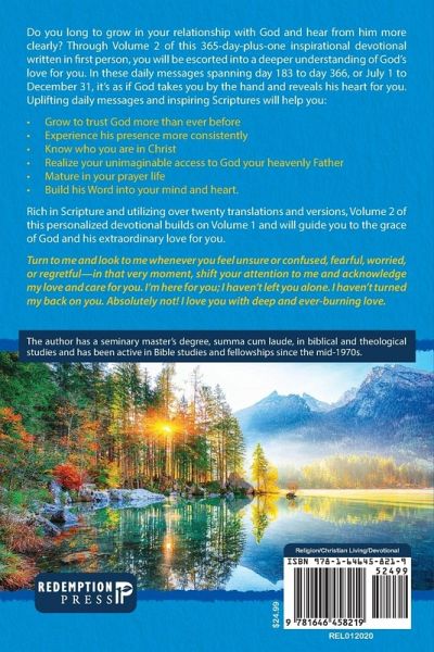 Do you long to grow in your relationship with God and hear from him more clearly? Through Volume 2 of this 365-day-plus-one inspirational devotional written in first person, you will be escorted into a deeper understanding of God's love for you. In these daily messages spanning day 183 to day 366, or July 1 to December 31, it's as if God takes you by the hand and reveals his heart for you. Uplifting daily messages and inspiring Scriptures will help you: Grow to trust God more than ever before Experience his presence more consistently Know who you are in Christ Realize your unimaginable access to God your heavenly Father Mature in your prayer life Build his Word into your mind and heart. Rich in Scripture and utilizing over twenty translations and versions, Volume 2 of this personalized devotional builds on Volume 1 and will guide you to the grace of God and his extraordinary love for you. Turn to me and look to me whenever you feel unsure or confused, fearful, worried, or regretful-in that very moment, shift your attention to me and acknowledge my love and care for you. I'm here for you; I haven't left you alone. I haven't turned my back on you. Absolutely not! I love you with deep and ever-burning love.