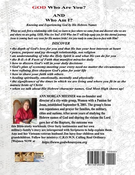 WHEN WE KNOW AND UNDERSTAND who God is, we grow to know who we are and where we are going by facing where we came from. Miesner guides readers through the stories of forty real women and families as they experience God in their daily lives, so that they too might commit themselves 100 percent to Jesus Christ before His return. DISCOVER: the depth of God's love for you and that He has your best interests at heart relationship, not religion an understanding of who Holy Spirit is and what He can do for you the B-E-A-R Facts of Faith that manifest miracles daily how to discern God's will in your daily decisions God's plan of economy--meeting your every need--no matter the circumstances how refining fires sharpen God's plan for your life how to share your faith with others healing spiritually, emotionally, mentally and physically significance of the times in which we are living and where you fit in as the mature bride of Christ The book was birthed over seven years in the city-wide Bible study group established Sept. 8, 2001. The group's focus was repentance and prayer for families, the military, cities, and nations. After those seven years of studying the Hebrew names of God and sharing Supernatural Event #1 1994 and Supernatural Event #2 1995 of the Rapture the Lord gave her, the outcome was this Bible study workbook. Miesner spent five additional years transposing over forty women's incredible testimonies with fictional techniques. She felt she was merely a bystander as their stories fell into a chronological pattern, along with her family's story, explaining the Hebrew names of God' character, and actually writing this book from beginning to end. Readers will travel from Genesis to Revelation 12 as an overcomer sharing their own testimony. This workbook is solid, Scriptural teaching of eternal truths lived out in the lives of real, ordinary people who know who they are and where they are going, because they faced where they came from. Furthermore, they are prepared for Jesus’ return. HOW THE BOOK IS ORGANIZED FOUR PARTS: Leaving Bondage; Lessons in the Wilderness; Crossing Jordan River; and Possessing Promised Land Plan. A book and a workbook: 12 modules – 2 chapters each with 5 components in each module: 1st Chapter – Hebrew name of God teaching with fictional stories throughout 2nd Chapter – Because God is . . . , what does that mean to me My/Our Story of our family’s journey Making It Personal fill-in-the-blanks, matching, and multiple-choice fun exercises Because God is ... I am personalized, daily confessional Scriptures from each module at the end (also available in booklet form) HOW AND FOR WHOM THE BOOK CAN BE USED 13 or 23-week small-group study personal devotional workbook neighborhood Bible study; small group Bible study; cell group; as a house church book A leader’s guide was developed over ten years of leading this study as a discipleship handbook for women, with neighbors in homes, as an Each-One-Teach-One mentoring book at restaurants, and with Christian groups in churches. It has proved to be great counseling for military families, individuals and in couples Bible studies. [Workbook also available in Spanish and Russian.]
