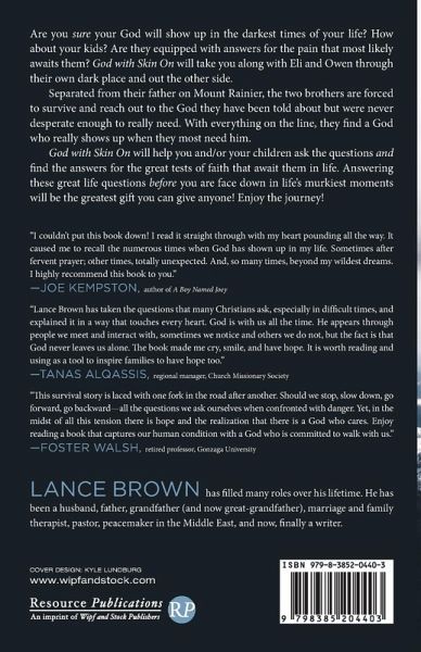 Are you sure your God will show up in the darkest times of your life? How about your kids? Are they equipped with answers for the pain that most likely awaits them? God with Skin On will take you along with Eli and Owen through their own dark place and out the other side. Separated from their father on Mount Rainier, the two brothers are forced to survive and reach out to the God they have been told about but were never desperate enough to really need. With everything on the line, they find a God who really shows up when they most need him. God with Skin On will help you and/or your children ask the questions and find the answers for the great tests of faith that await them in life. Answering these great life questions before you are face down in life's murkiest moments will be the greatest gift you can give anyone! Enjoy the journey!
