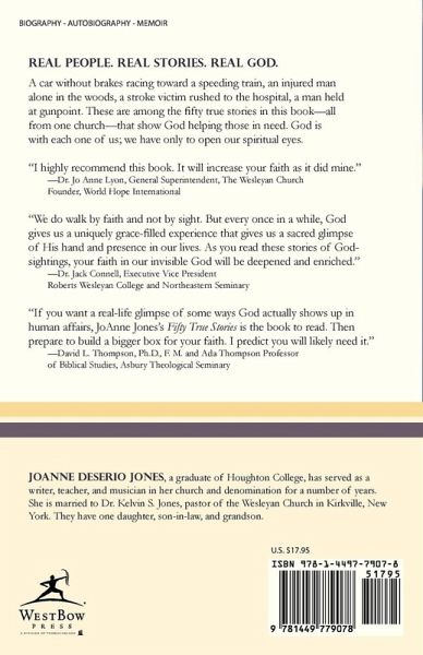 Real people. Real stories. Real God. A car without brakes racing toward a speeding train, an injured man alone in the woods, a stroke victim rushed to the hospital, a man held at gunpoint. These are among the fifty true stories in this book—all from one church—that show God helping those in need. God is with each one of us; we have only to open our spiritual eyes. "I highly recommend this book. It will increase your faith as it did mine." —Dr. Jo Anne Lyon, General Superintendent, The Wesleyan Church Founder, World Hope International "We do walk by faith and not by sight. But every once in a while, God gives us a uniquely grace-filled experience that gives us a sacred glimpse of His hand and presence in our lives. As you read these stories of God-sightings, your faith in our invisible God will be deepened and enriched." —Dr. Jack Connell, Executive Vice President Roberts Wesleyan College and Northeastern Seminary "If you want a real-life glimpse of some ways God actually shows up in human affairs, JoAnne Jones’s Fifty True Stories is the book to read. Then prepare to build a bigger box for your faith. I predict you will likely need it." —David L. Thompson, Ph.D., F. M. and Ada Thompson Professor of Biblical Studies, Asbury Theological Seminary
