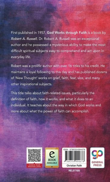 First published in 1957, 'GOD Works through Faith' is a book by Robert A. Russell. Dr. Robert A. Russell was an exceptional author and he possessed a mysterious ability to make the most difficult spiritual subjects easy to comprehend and act upon in everyday life. Robert was a prolific author with over 16 titles to his credit. He maintains a loyal following to this day and has published dozens of 'New Thought' works on grief, faith, fear, vice, and many other inspirational subjects. This title talks about faith-related issues, particularly the definition of faith, how it works, and what it does to an individual. It teaches about the way in which God works and more about what the power of faith can accomplish.