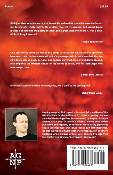 A poem for each of the weekly Torah portions, written by Los Angeles poet Rick Lupert who immersed himself in the weekly text and came out on the other side with a poem that adds humor, modern insight, and "reverent irreverence" to his interpretations of these ancient stories around which modern-day Judaism has developed. This collection of Jewish poetry adds to Lupert's growing canon of Judaic liturgy interpretations which have found receptive audiences and readers, from all over the world, who are seeking modern interpretations of our oldest text. With just a few exquisite words, Rick Lupert fills in the white spaces between the Torah's words, and offers holy insight, life wisdom, reverent irreverence, and sacred depth. It takes a poet to find the poetry of Torah, and a great teacher to share it. Rick is both. His book is a gift to us all. -Rabbi Ed Feinstein One can always count on Rick to see things in ways that we would not otherwise have seen them. He has succeeded in finding messages within each parashah that are simultaneously uniquely personal and entirely universal. Humor and depth abound. Rick amplifies the timeless nature of the words of Torah, and fills each page with new perspectives. -Cantor Ellen Dreskin Rick Lupert’s poetry is witty, knowing, wise, and a tonic to the seeking soul. -Rabbi David Wolpe