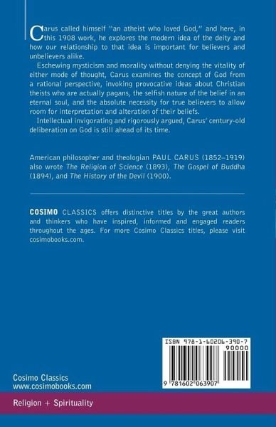 Carus called himself "an atheist who loved God," and here, in this 1908 work, he explores the modern idea of the deity and how our relationship to that idea is important for believers and unbelievers alike. Eschewing mysticism and morality without denying the vitality of either mode of thought, Carus examines the concept of God from a rational perspective, invoking provocative ideas about Christian theists who are actually pagans, the selfish nature of the belief in an eternal soul, and the absolute necessity for true believers to allow room for interpretation and alteration of their beliefs. Intellectual invigorating and rigorously argued, Carus' century-old deliberation on God is still ahead of its time. American philosopher and theologian PAUL CARUS (1852-1919) also wrote The Religion of Science (1893), The Gospel of Buddha (1894), and The History of the Devil (1900).
