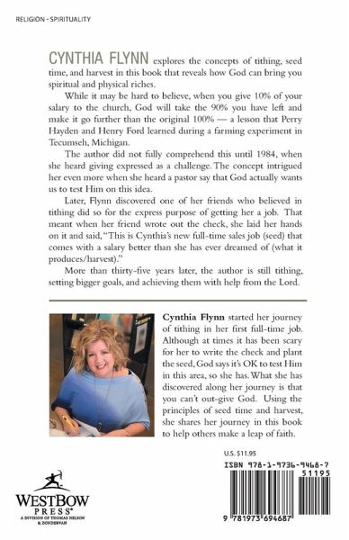 Cynthia Flynn explores the concepts of tithing, seed time, and harvest in this book that reveals how God can bring you spiritual and physical riches. While it may be hard to believe, when you give 10% of your salary to the church, God will take the 90% you have left and make it go further than the original 100% - a lesson that Perry Hayden and Henry Ford learned during a farming experiment in Tecumseh, Michigan. The author did not fully comprehend this until 1984, when she heard giving expressed as a challenge. The concept intrigued her even more when she heard a pastor say that God actually wants us to test Him on this idea. Later, Flynn discovered one of her friends who believed in tithing did so for the express purpose of getting her a job. That meant when her friend wrote out the check, she laid her hands on it and said, "This is Cynthia's new full-time sales job (seed) that comes with a salary better than she has ever dreamed of (what it produces/harvest)." More than thirty-five years later, the author is still tithing, setting bigger goals, and achieving them with help from the Lord.