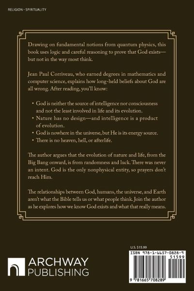 Drawing on fundamental notions from quantum physics, this book uses logic and careful reasoning to prove that God exists-but not in the way most think. Jean Paul Corriveau, who earned degrees in mathematics and computer science, explains how long-held beliefs about God are all wrong. After reading, you'll know: ¿ God is neither the source of intelligence nor consciousness and not the least involved in life and its evolution. ¿ Nature has no design-and intelligence is a product of evolution. ¿ God is nowhere in the universe, but He is its energy source. ¿ There is no heaven, hell, or afterlife. The author argues that the evolution of nature and life, from the Big Bang onward, is from randomness and luck. There was never an intent. God is the only nonphysical entity, so prayers don't reach Him. The relationships between God, humans, the universe, and Earth aren't what the Bible tells us or what people think. Join the author as he explores how we know God exists and what that really means.