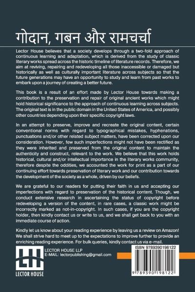 Godaan, Gaban Aur Ramcharcha This book is a result of an effort made by us towards making a contribution to the preservation and repair of original classic literature. In an attempt to preserve, improve and recreate the original content, we have worked towards: 1. Type-setting & Reformatting: The complete work has been re-designed via professional layout, formatting and type-setting tools to re-create the same edition with rich typography, graphics, high quality images, and table elements, giving our readers the feel of holding a 'fresh and newly' reprinted and/or revised edition, as opposed to other scanned & printed (Optical Character Recognition - OCR) reproductions. 2. Correction of imperfections: As the work was re-created from the scratch, therefore, it was vetted to rectify certain conventional norms with regard to typographical mistakes, hyphenations, punctuations, blurred images, missing content/pages, and/or other related subject matters, upon our consideration. Every attempt was made to rectify the imperfections related to omitted constructs in the original edition via other references. However, a few of such imperfections which could not be rectified due to intentional\unintentional omission of content in the original edition, were inherited and preserved from the original work to maintain the authenticity and construct, relevant to the work. We believe that this work holds historical, cultural and/or intellectual importance in the literary works community, therefore despite the oddities, we accounted the work for print as a part of our continuing effort towards preservation of literary work and our contribution towards the development of the society as a whole, driven by our beliefs. We are grateful to our readers for putting their faith in us and accepting our imperfections with regard to preservation of the historical content. HAPPY READING!