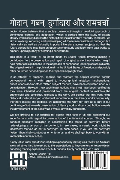 Godaan, Gaban, Durgadas Aur Ramcharcha This book is a result of an effort made by us towards making a contribution to the preservation and repair of original classic literature. In an attempt to preserve, improve and recreate the original content, we have worked towards: 1. Type-setting & Reformatting: The complete work has been re-designed via professional layout, formatting and type-setting tools to re-create the same edition with rich typography, graphics, high quality images, and table elements, giving our readers the feel of holding a 'fresh and newly' reprinted and/or revised edition, as opposed to other scanned & printed (Optical Character Recognition - OCR) reproductions. 2. Correction of imperfections: As the work was re-created from the scratch, therefore, it was vetted to rectify certain conventional norms with regard to typographical mistakes, hyphenations, punctuations, blurred images, missing content/pages, and/or other related subject matters, upon our consideration. Every attempt was made to rectify the imperfections related to omitted constructs in the original edition via other references. However, a few of such imperfections which could not be rectified due to intentional\unintentional omission of content in the original edition, were inherited and preserved from the original work to maintain the authenticity and construct, relevant to the work. We believe that this work holds historical, cultural and/or intellectual importance in the literary works community, therefore despite the oddities, we accounted the work for print as a part of our continuing effort towards preservation of literary work and our contribution towards the development of the society as a whole, driven by our beliefs. We are grateful to our readers for putting their faith in us and accepting our imperfections with regard to preservation of the historical content. HAPPY READING!