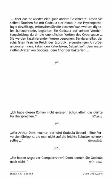 Was treiben die Computer so, wenn sie sich langweilen? Richtig, sie erfinden Geschichten, mehr noch: Sie inszenieren ganze Wirklichkeiten. Mit Godcula tauchen wir hinab in die Psychopathologie des Alltags, erforschen die bizarren Wahnwelten digitaler Schizophrenie, begleiten ihn auf seinem Vernichtungsfeldzug des Cyberspace und begegnen faszinierenden Wesen: Bandaraneike, der schärfsten Frau im Reich der Esorotik, eigensinnigen Anrufbeantworterinnen, kakelnden Kakerlaken, Sebastian, dem materiellen Avatar von Godcula, dem Chor der Bakterie ...
